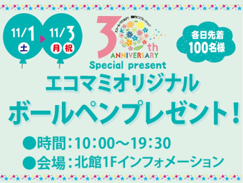 エコール・マミ(専門店・近鉄プラザ・エディオン・コーナン)での11/1(土)・11/2(日)2日間のお買上げレシート合計3,000円ごとに1回、抽選いただけます!